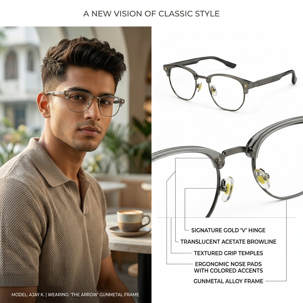| Style | Vintage Modern / Design-Forward | Frame Type | Semi-Rim (Metal + TR Mix) |